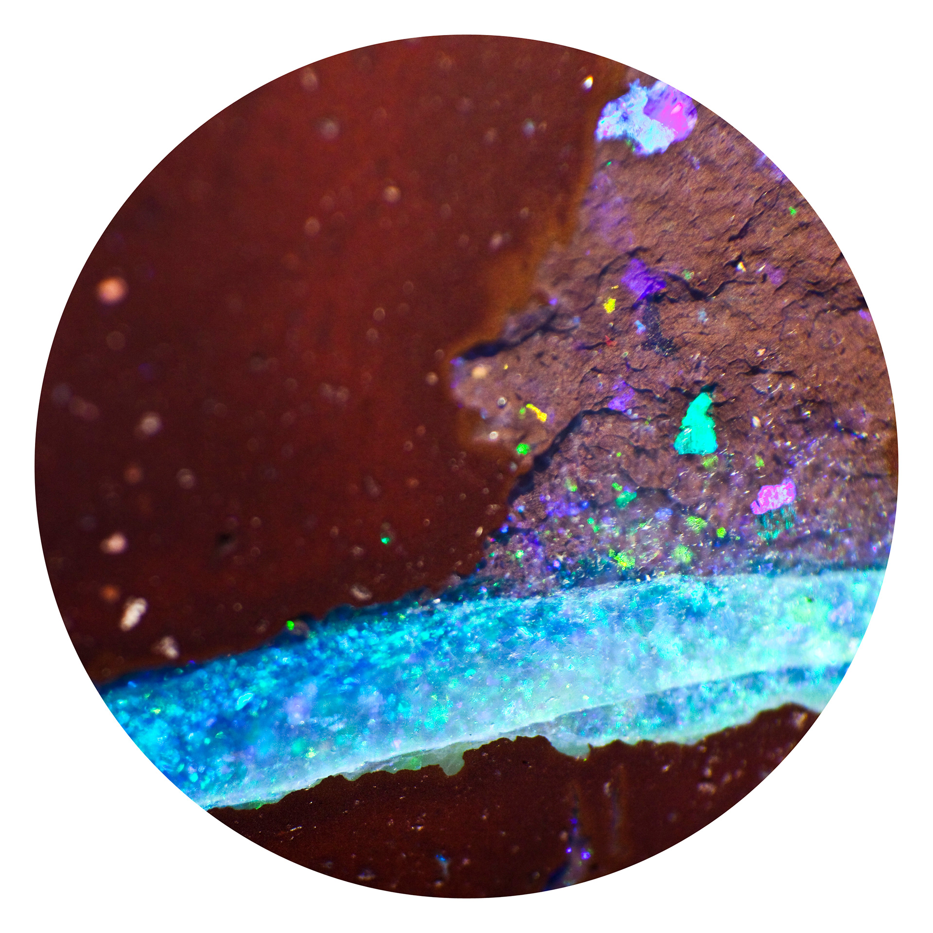Opal is a hydrated amorphous form of silica; its water content may range from 3% to 21% by weight, but is usually between 6% to 10%. Because of its amorphous character it is classed as a mineraloid, unlike the other crystalline forms of silica which are classed as minerals. It is deposited at a relatively low temperature and may occur in the fissures of almost any kind of rock, being most commonly found with limonite, sandstone, rhyolite, marl and basalt. (Wikipedia.org)